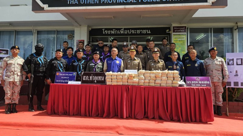 ปรากฏว่าชายคนขับรถ จยย. มีอาการเหงื่อแตกทั้งที่อากาศครึ้ม มือสั่น พูดจาวกวน ยิ่งเพิ่มความสงสัยแก่เจ้าหน้าที่ ทราบเบื้องต้นชายต้องสงสัยรายนี้ชื่อนายธัญเทพ โชคมนทิน หรือเก้า อายุ 37 ปี เป็นชาว อ.บึงโขงหลง จ.บึงกาฬ ค้นในตัวก็แจ๊คพอทแตกเพราะเจอยาบ้า 141 เม็ด ซ่อนอยู่ที่ขอบกางเกงที่นายเก้าสวมใส่อยู่ ส่วนที่แฮนด์รถมีกระเป๋าสีดำ พอรูดซิปเปิดออกก็เจอห่อบรรจุยาบ้า มีสัญลักษณ์อักษร Y1 จำนวน 1 ห่อ จึงควบคุมตัวนายเก้าไปสอบสวนที่ สภ.ท่าอุเทน และตรวจนับยาบ้าคร่าวๆประมาณ 32,000 เม็ด