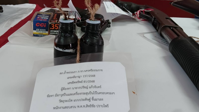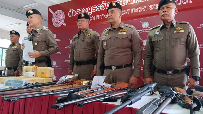 สำหรับการกวาดล้างอาชญากรรมดังกล่าว โดยสถานีตำรวจในสังกัดพร้อมด้วยกองกำกับการสืบสวนตำรวจภูธรจังหวัดนครศรีธรรมราช ระดมกวาดล้างอาชญากรรม ห้วงที่ 2 ระหว่างวันที่ 15 – 18 กรกฎาคม 2568 และกำหนดมาตรการ “ยุทธการยึดปืนเมืองคอน” โดยทุกหน่วยในสังกัดกำหนดเป้าหมายคุณภาพอาวุธปืน ยาเสพติด หมายจับ และทำการปล่อยแถวระดมตรวจค้นพร้อมกัน ในวันที่ 17 กรกฎาคม 2568 ที่ผ่านมานั้น ผลการการระดมกวาดล้างอาชญากรรม ตำรวจภูธรจังหวัดนครศรีธรรมราช สามารถจับกุมผู้กระทำผิดตาม พรบ.อาวุธปืน พร้อมเครื่องกระสุนปืนและ พ.ร.บ.ยาเสพติด พร้อมผู้ต้องหาในคดี สามารถจับกุมตาม พรบ.อาวุธปืนฯ จำนวน 44 ราย ผู้ต้องหา 48 คน แยกเป็น วัตถุระเบิด ของกลางจำนวน 2 ลูก อาวุธปืนมีทะเบียน ของกลางจำนวน 13 กระบอก, อาวุธปืนไม่มีทะเบียน ของกลางจำนวน 26 กระบอก, เครื่องกระสุนปืน ของกลางจำนวน 184 นัด ผลการจับกุมตาม พรบ.ยาเสพติด จำนวน 170 ราย ผู้ต้องหา 170 คน แยกเป็น ยาบ้า ของกลางจำนวน 115,860 เม็ด ยาไอซ์ ของกลางจำนวน 131.76 กรัม