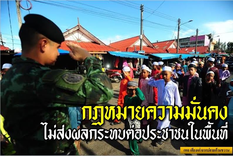 แม้ว่าในพื้นที่จังหวัดชายแดนภาคใต้ จะใช้กฎหมายความมั่นคง แต่การปฏิบัติของเจ้าหน้าที่ต่อพี่น้องประชาชน ไม่ได้มีความแตกต่างจากกฎหมายปกติเลย ไม่ว่าจะเป็นการเดินทางการประกอบอาชีพ การประกอบพิธีกรรมทางศาสนา หรือแม้แต่การดำเนินชีวิตประจำวันก็ไม่ส่งผลกระทบใดๆ ทั้งสิ้น มีแต่เพียงกลุ่มผู้ก่อเหตุรุนแรงเท่านั้น ที่จะได้รับผลกระทบจากการปฏิบัติงานของเจ้าหน้าที่ โดยที่ผ่านมาในการปิดล้อมตรวจค้นจะสามารถจับกุมกลุ่มผู้ก่อเหตุรุนแรงหรือแนวร่วมได้เกือบทุกครั้ง ก็เพราะใช้กฎหมายความมั่นคง จึงทำให้เจ้าหน้าที่สามารถปฏิบัติงานได้อย่างรวดเร็ว แน่นอน และไม่ผิดตัว…