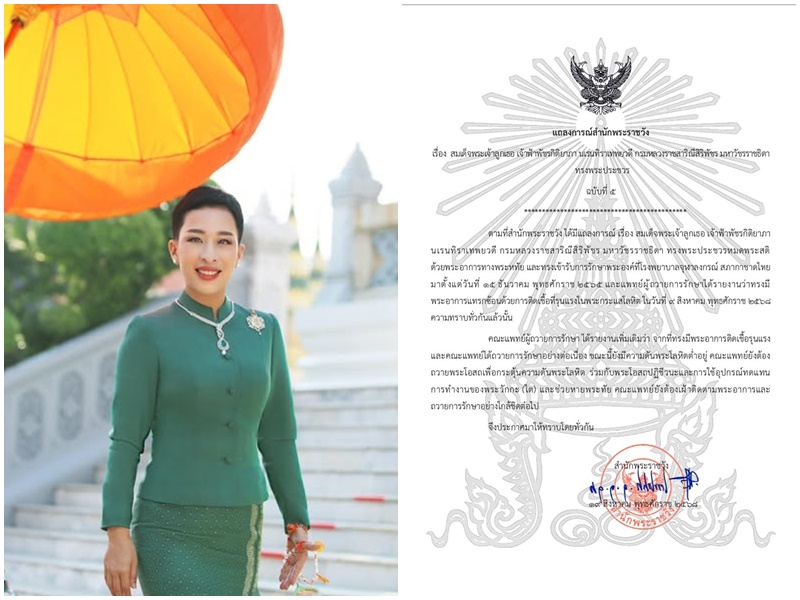 แถลงการณ์สำนักพระราชวังเรื่อง สมเด็จพระเจ้าลูกเธอ เจ้าฟ้าพัชรกิติยาภา นเรนทิราเทพยวดี กรมหลวงราชสาริณีสิริพัชร มหาวัชรราชธิดาทรงพระประชวร ฉบับที่ ๕