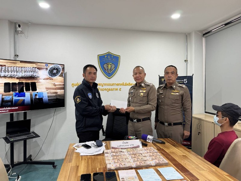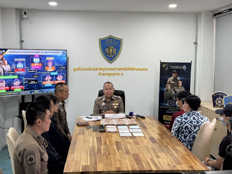 - ศปอส.ภ.5 ร่วมกับ บก.สส.ภ.5 จับกุม 2 คนจีน ร่วมบัญชีม้าคนไทย ขบวนการถอนเงินเชื่อมโยงแก๊งคอลเซ็นเตอร์ ตรวจยึดเงินสด 1,539,000 บาท ถอนทันทีหลังผู้เสียหายโอนไปเพียง 25 นาที
