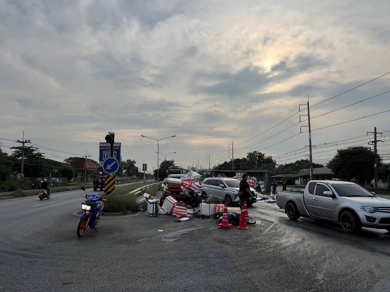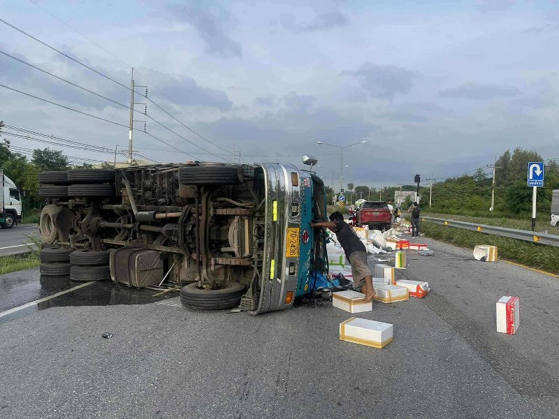 เมื่อวันที่ 2 กันยายน 2568 เวลาประมาณ 07:10 น. ภาพจากกล้องหน้ารถจับภาพได้ขณะรถบรรทุกตู้อาหารทะเลสดเสียหลักหักหลบรถบรรทุก 6 ล้อ ขณะกลับรถยูเทิร์น เลยทางด่วนขาเข้า กทม.หน้า นิคมอุตสาหกรรมนวนคร 2 สูงเนิน ต.นากลาง อ.สูงเนิน จ.นครราชสีมา ภาพจากคลิปหน้าจากรถ จับได้ภาพได้รถบรรทุกตู้ 10 ล้อ HINO ทะเบียน 70-2436 สีเขียว ป้ายทะเบียนสระแก้ว มาด้วยความเร็วมาถึงจุดเกิดเหตุหักหลบรถบรรทุก 6 ล้อ สีขาวไม่ทราบป้ายทะเบียนขณะรอยูเทริน ทำให้พุ่งเสียหลักพลิกคว่ำทับรถจักรยานยนต์ Honda เวฟ125i สีน้ำเงิน ทะเบียน2 กย 2806 นม สาวโรงงานขับรถจักรยานยนต์พังยับเยิน เฉียดตาย ตามคลิปหน้ารถ ได้รับบาดเจ็บเล็กน้อยรู้สึกตัวดีมีอาการปวดหัวขอไปโรงพยาบาลเอง