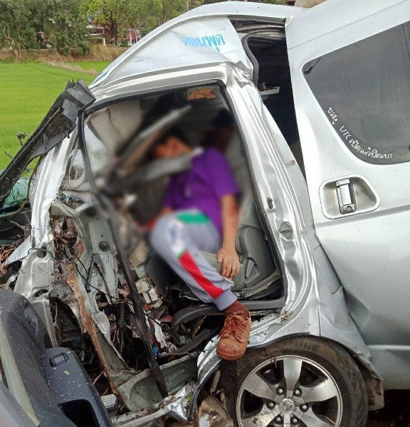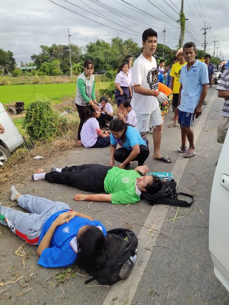 ที่เกิดเหตุพบรถยนต์ตู้ ยี่ห้อ โตโยต้า สีบรอนซ์ เงิน หมายเลขทะเบียน ฮฉ-4971 กรุงเทพ มหานคร ตกอยู่ข้างทางในสภาพพังยับเยิน มีผู้ได้รับบาดเจ็บล้วนเป็นเด็กนักเรียน เจ้าหน้าที่มูลนิธิฯ แพทย์พยาบาลได้ทำการช่วยเหลือนำร่างออกมาจากซากรถ ปฐมพยาบาลในเบื้องต้นก่อนรีบนำตัวส่ง และยังมีเด็กนักเรียนติดคาซากรถอยู่อีกหลายราย เจ้าหน้าที่ได้ใช้เครื่องตัดถ่างนำร่างออกมาได้ในเวลาต่อมาหลายรายอาการสาหัส