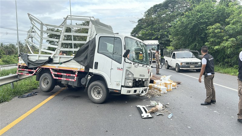 ที่เกิดเหตุพบเป็นรถยนต์กระบะรั้วบรรทุก 4 ล้อขนาดใหญ่ ยี่ห้อ isuzu สีขาว หมายเลขทะเบียน 3 ฒฆ 5327 กทม.สภาพพังเสียหายยับเยินกระบะรั้วฉีกขาดตัวรถได้รับความเสียหาย สิ่งของที่บรรทุกมาหล่นกระจัดกระจายเกลื่อน ตรวจสอบเบื้องต้นเป็นชิ้นส่วนแผ่นไม้ที่รื้อมาจากบ้านเก่า โดยภายในกองไม้พบกล่องโฟมห่อหุ้มด้วยถุงพลาสติกใสปิดทับด้วยเทปกาวสีน้ำตาลแน่นหนา จำนวน 54 กล่อง โดยมีบางกล่องฉีกขาดปรากฏสิ่งของที่บรรจุภายในกล่องเป็นยาบ้าเม็ดสีส้มจำนวนมาก ส่วนผู้ขับขี่และผู้โดยสารไม่ทราบจำนวนได้หลบหนีไปจากที่เกิดเหตุแล้ว