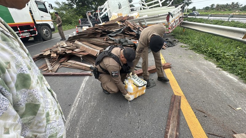 ประจวบคีรีขันธ์ – กระบะบรรทุกไม้เก่ายางระเบิดพลิกคว่ำ พบกล่องโฟมกระเด็นเกลื่อน ตะลึง..!! บรรจุยาบ้า 5.4 ล้านเม็ด