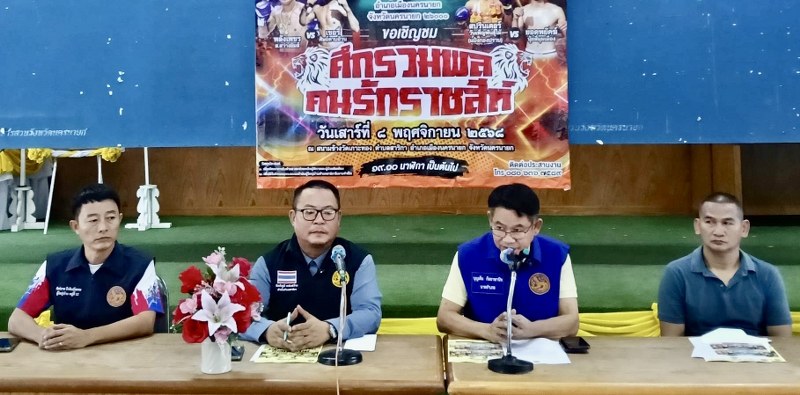 วันที่ 8 กันยายน 2568 ที่ห้องประชุมที่ว่าการอำเภอเมืองนครนายก นายกิตติภูมิ แสงสว่าง กำนันต.สาริกา อ.เมือง จ.นครนายก ผู้จัดชกมวยการกุศล ”ศึกรวมพล คนรักราชสีห์“ เปิดแถลงข่าวการจัดชกมวยการกุศล โดยมี นายบุญเต็ม กัลยาพานิช นายอำเภอเมืองนครนายก ให้เกียรติเป็นประธานเปิดแถลงข่าวการชกมวยการกุศล พร้อมด้วย นายคม ปากช่อง และนายแมะ บ้านนา ร่วมแถลงข่าวใน ”ศึกรวมพลคนรักราชสีห์” ที่จะจัดขึ้นในวันที่ 8 พฤศจิกายน 2568 ที่บริเวณสนามวัดเกาะทอง ต.สาริกา อ.เมือง จ.นครนายก มีทั้งหมด 15 คู่ โดยมีคู่เอกระหว่างสปรินเตอร์(แป๋งกองปราบ)วันเพ็ญพันธุ์ไม้ VS ยอดพยัคฆ์ นุ้ยสี่มุมเมือง ส่วนคู่รองระหว่างพลังเพชร ส.สว่างยิมส์ VS เชอรี่ ศิษย์ดาบอ้วน และคู่อื่นๆอีก 13 คู่ โดยมีผู้เข้าร่วมงานแถลงข่าวและให้ความสนใจกว่า 50 คน ในครั้งนี้