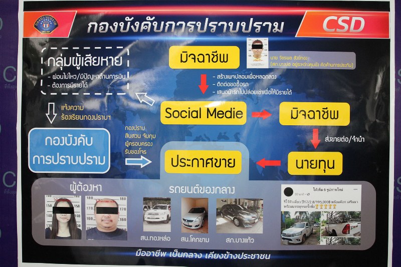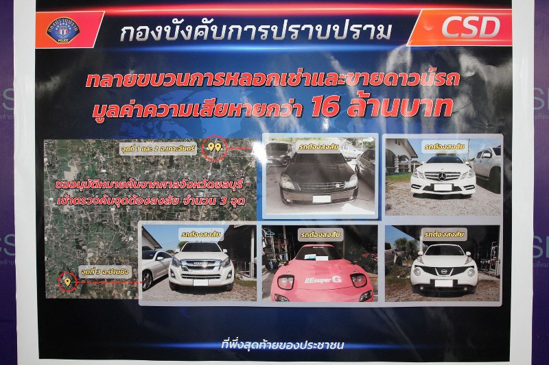 พ.ต.อ.สุรพงษ์ฯ กล่าวว่า สืบเนื่องมาจากทางตำรวจกองปราบฯ ได้รับการร้องเรียนจากกลุ่มผู้เสียหาย จำนวน 16 คน จากหลายพื้นที่ ทั้ง กทม.และปริมณฑล ว่าถูก นายวัชรพลฯ หลอกทำทีมาติดต่อขอเช่ารถยนต์ และหลอกขอซื้อดาวน์รถต่อจากผู้เสียหาย โดยอ้างว่าจะดำเนินการเปลี่ยนสัญญา และจะผ่อนชำระค่างวดต่อ แต่เมื่อได้รถไปแล้วนายวัชรพลฯ นำรถหนีหายไป ที่ผ่านมามีผู้เสียหายถูกนายวัชรพลฯ หลอกเชิดรถไปแล้วจำนวน 18 คัน มูลค่าความเสียหายกว่า18 ล้านบาท ทั้งนี้ภายหลังรับเรื่องทางกองปราบฯ ได้สั่งการให้เจ้าหน้าที่ชุดจับกุมลงพื้นที่สืบหาเบาะแส จนทราบว่ามีรถยนต์ของผู้เสียหายจำนวน 3 คัน ถูกจอดติดป้ายประกาศขายอยู่ที่ลานจอดรถปั๊มน้ำมันแห่งหนึ่งในพื้นที่ ต.หนองไผ่แก้ว อ.บ้านบึง จ.ชลบุรี จึงนำกำลังไปตรวจสอบ กระทั่งพบนายสิทธิพงษ์ฯ และน.ส.สุทาวันฯ แสดงตัวเป็นผู้ครอบครอง และเป็นผู้ขายรถ จึงได้ทำการจับกุมตัวดังกล่าว