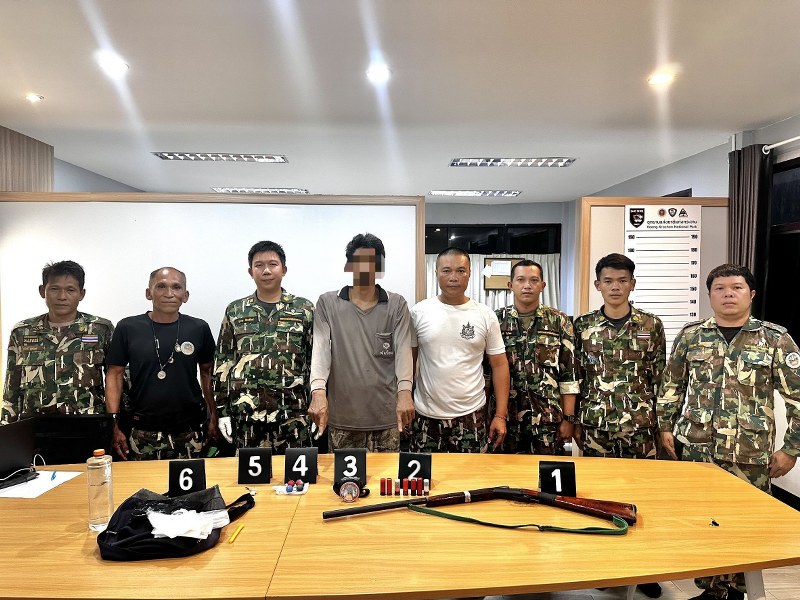 โดยเจ้าหน้าที่อุทยานแห่งชาติแก่งกระจาน โดยชุดลาดตระเวนที่ 12 เขาหินลาด ได้ร่วมกันลาดตระเวนเข้มข้นและดักซุ่มเพื่อป้องกันและปราบปรามการกระทำความผิดทางป่าไม้ ในพื้นที่หมู่ที่ 8 บ้านเขาแหลม ต.ป่าเด็ง อ.แก่งกระจาน จ.เพชรบุรี จากนั้น คณะเจ้าหน้าที่ได้ยิงเสียงปืน ดังขึ้น 1 นัด จึงเข้าทำการตรวจสอบ พบบุคคลชาย จำนวน 1 คน กำลังเดินสะพายอาวุธปืนยาวพร้อมกับส่องไฟฉายไปมา คณะเจ้าหน้าที่จึงได้วางแผนโอบล้อมเพื่อจับกุมชายคนดังกล่าว ก่อนแสดงตัวเข้าจับกุม จากนั้นจึงทำตรวจสอบ/ค้น พบ อาวุธปืนลูกซองยาวเดียว จำนวน 1 กระบอก กระสุนคารังเพลิง 1 นัด และกระสุนปืนลูกซองขนาดเบอร์ 12 จำนวน 6 นัด พร้อมกระเป๋าสะพาย คณะเจ้าหน้าที่จึงได้ควบคุมตัวชายดังกล่าว ทราบชื่อนายเชาวฤทธิ์ ปล้องทอง อายุ 46 ปี
