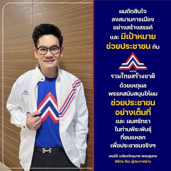 ได้คุยกับพรรคการเมืองหลายพรรคมาแล้ว จนในที่สุดเขาก็ได้ตัดสินใจร่วมเดินหน้าไปกับพรรครวมไทยสร้างชาติ เพราะเขาได้ทำการศึกษามาอย่างดีแล้วว่าเป็นพรรคที่ยึดมั่นในสถาบันหลักของชาติ เพราะฉะนั้นไม่ขายชาติแน่นอน รวมถึงพรรครวมไทยสร้างชาติได้ยึดถือความซื่อสัตย์สุจริตเป็นที่ตั้ง ดังที่เห็นได้จากความไม่พอใจของนายทุนพลังงาน ตามที่เป็นข่าวไปก่อนหน้านี้ และเป็นพรรคที่เห็นผลประโยชน์ของประชาชนเป็นที่ตั้ง ดูได้จากการตรึงราคาก๊าชหุงต้ม การลดราคาค่าไฟอย่างต่อเนื่อง รวมทั้งการเสนอแก้ไขกฎหมายเรื่องน้ำมันอีกด้วย
