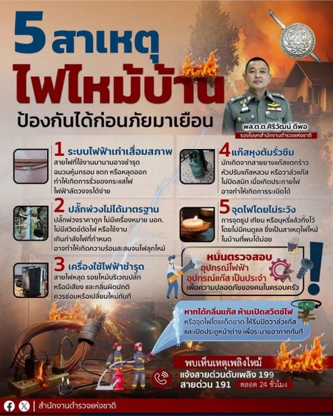 สำนักงานตำรวจแห่งชาติจึงขอแนะนำประชาชนให้ตระหนักถึง 5 สาเหตุหลักของการเกิดอัคคีภัยในครัวเรือน เพื่อให้สามารถตรวจสอบและป้องกันได้ก่อนเกิดเหตุไม่คาดคิด ดังนี้