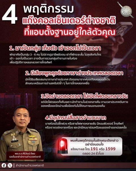 2.) สำนักงานตำรวจแห่งชาติตีแผ่ 4 พฤติกรรมแก๊งคอลเซ็นเตอร์ที่แอบตั้งฐานปฏิบัติการ หากพบขอให้รีบแจ้ง