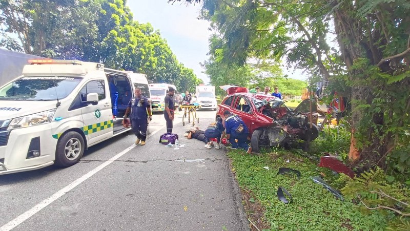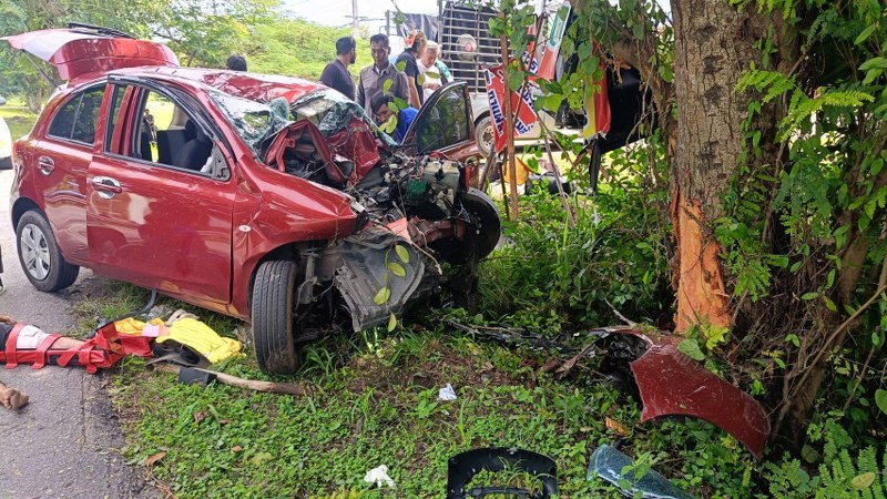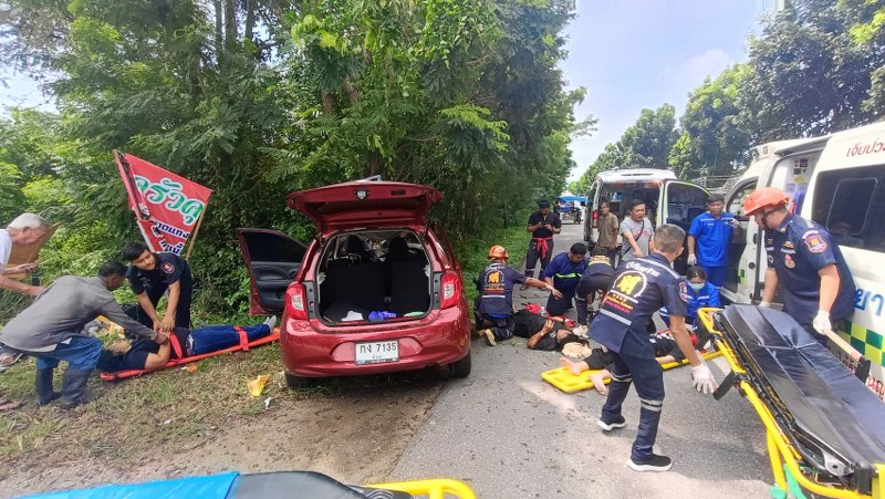 เก๋งแม่ – ลูก เสียหลักชนต้นไม้ริมทาง เจ็บสาหัส 4 ราย คาดหลับใน