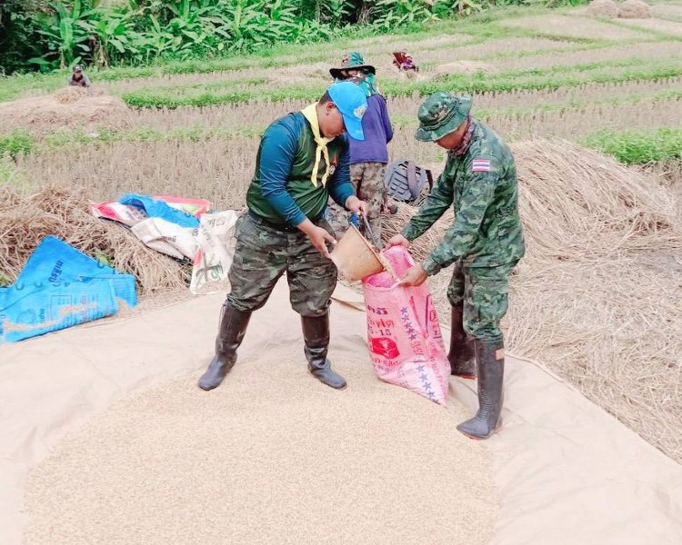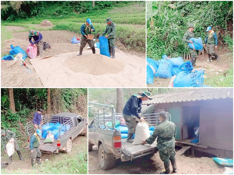 มณฑลทหารบกที่ 37 จัดกำลังพลจิตอาสาพระราชทาน จัดกิจกรรม “ช่วยด้วยใจ ลดรายจ่าย สร้างรายได้” ด้วยการช่วยราษฎรบรรจุข้าวใส่กระสอบและขนย้ายไปเก็บไว้ในยุ้งข้าว เพื่อเก็บไว้บริโภคในครัวเรือน ณ โครงการบ้านเล็กในป่าใหญ่ ตามพระราชดำริ บ้านห้วยหญ้าไซ ตำบลป่าแดด อำเภอแม่สรวย จังหวัดเชียงราย
