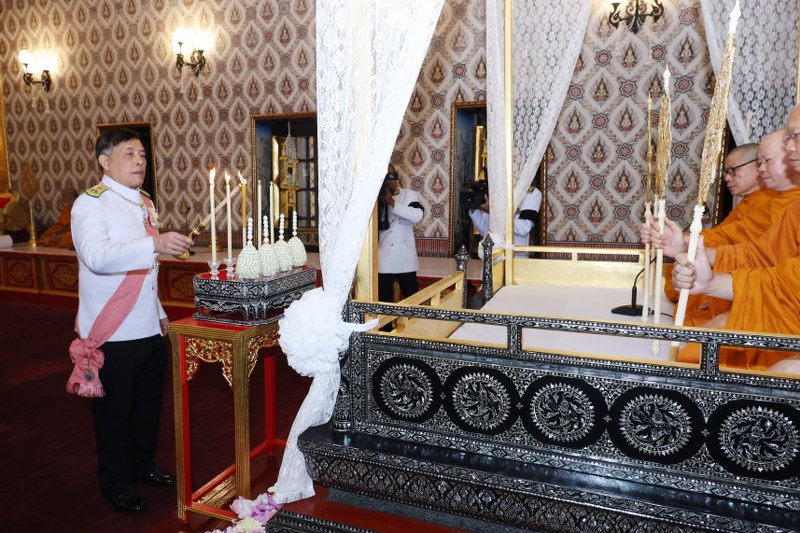 ต่อจากนั้น พระบาทสมเด็จพระเจ้าอยู่หัว ทรงจุดธูปเทียนเครื่องนมัสการพานทองสองชั้นบูชาพระพุทธรูปประจำพระชนมวาร ที่หน้าพระแท่นพระนพปฎลมหาเศวตฉัตร ทรงกราบ แล้วประทับพระราชอาสน์ พระสงฆ์ 30 รูป สวดพระพุทธมนต์ จบแล้ว ถวายอดิเรก ถวายพระพรลา เสร็จแล้ว พระบาทสมเด็จพระเจ้าอยู่หัว ทรงจุดเทียนดูหนังสือเทศน์พระราชทานแก่เจ้าพนัก งานพระราชพิธีเชิญไปปักที่โต๊ะ ข้างธรรมาสน์ ต่อจากนั้น พระบาทสมเด็จพระเจ้าอยู่หัว และสมเด็จพระนางเจ้า ฯ พระบรมราชินี ทรงจุดธูปเทียนเครื่องทรงธรรม เสร็จแล้ว