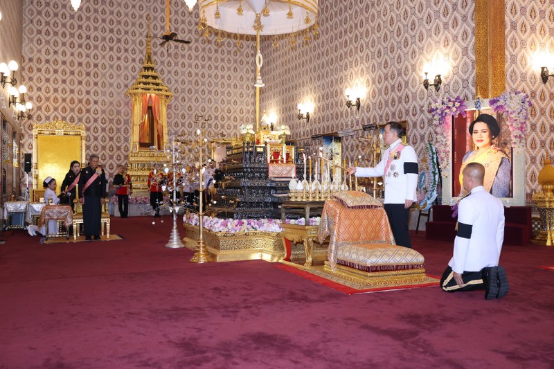 เมื่อเสด็จพระราชดำเนินถึงพระที่นั่งดุสิตมหาปราสาท พระบาทสมเด็จพระเจ้าอยู่หัว ทรงจุดธูปเทียนเครื่องราชสักการะทองลงยาราชาวดี และทรงจุดธูปเทียนเครื่องทองน้อย สมเด็จพระนางเจ้า ฯ พระบรมราชินี ทรงจุดธูปเทียนเครื่องราชสักการะทองลงยารอง และทรงจุดธูปเทียนเครื่องทองน้อยที่หน้าพระโกศพระบรมศพ สมเด็จพระนางเจ้าสิริกิติ์ พระบรมราชินีนาถ พระบรมราชชนนีพันปีหลวง จากนั้น พระบาทสมเด็จพระเจ้าอยู่หัว ทรงจุดธูปเทียนเครื่องนมัสการพานทองสองชั้นบูชาพระพุทธรูปประจำพระชนมวารที่หน้าพระแท่นพระนพปฎล