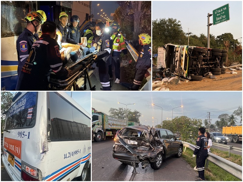 ระทึก !! รถทัวร์โดยสารชนสิบล้อบาดเจ็บนับ 10 ขณะช่วยเหลือเกิดเหตุซ้ำซ้อนชนท้ายกัน 6 คัน ติดภายในชุลมุน