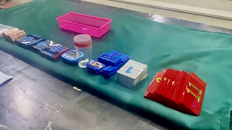 จากการตรวจสอบในที่เกิดเหตุ เจ้าหน้าที่สามารถระบุตัวบุคคลสำคัญประกอบด้วย นาย ศุภณัฐ (สงวนนามสกุล) อายุ 23 ปี ภูมิลำเนาจังหวัดสุราษฎร์ธานี รับสารภาพว่าเป็นเจ้ามือรับกินรับใช้ และ น.ส.ปราณี (สงวนนามสกุล) อายุ 28 ปี ภูมิลำเนาจังหวัดนครนายก รับสารภาพว่าเป็นเจ้าของบ้านสถานที่เกิดเหตุและเป็นผู้จัดให้มีการเล่นพนัน นอกจากนี้ยังสามารถตรวจยึดของกลางรวม 24 รายการ ได้แก่ เงินสดจำนวน 61,000 บาท ไพ่พลาสติก 3 สำรับ ผ้าปูรองเล่น ชิปแทนเงินสด การ์ดตัวเลข นาฬิกาจับเวลา รวมถึงอุปกรณ์อำนวยความสะดวก อาทิ โต๊ะยาว และเก้าอี้อีกจำนวน 24 ตัว ดำเนินคดี 38 ราย สารภาพเกลี้ยง