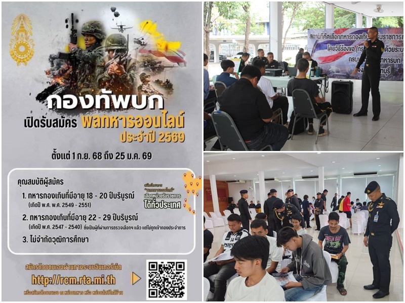 กองทัพบกเปิดรับสมัครทหารกองเกินเข้ารับราชการทหารกองประจำการ โดยวิธีร้องขอ (กรณีพิเศษ) ด้วยระบบออนไลน์ ประจำปี 2569 โดยเปิดโอกาสให้ชายไทยที่สนใจเข้ารับราชการทหารกองประจำการ (อายุ 18 – 20 ปีบริบูรณ์ และอายุ 22 – 29 ปีบริบูรณ์ที่ผ่านการตรวจเลือกฯ แล้วแต่ไม่ถูกเข้ากองประจำการ) สมัครด้วยตนเองผ่านระบบออนไลน์ได้ตั้งแต่วันนี้ถึง 25 มกราคม 2569 ตลอด 24 ชั่วโมง ที่เว็บไซต์ https://rcm.rta.mi.th หรือหน่วยสัสดีใกล้บ้าน