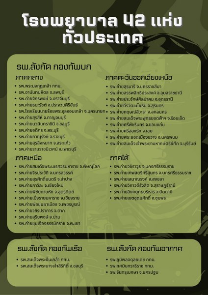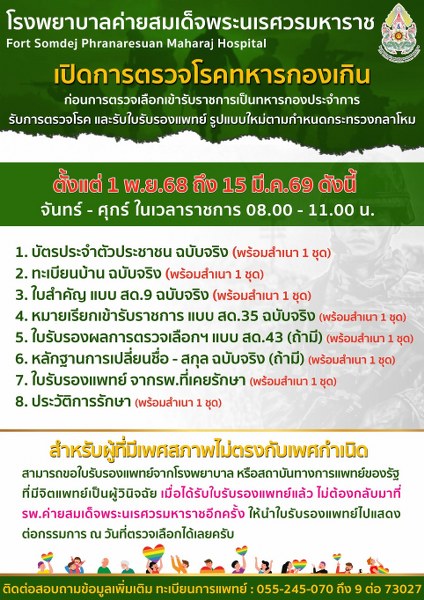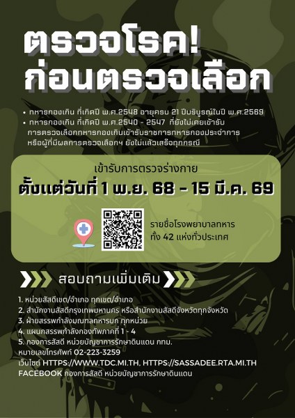 ทั้งนี้ เพื่อนำเอกสารหลักฐานทางการแพทย์ซึ่งโรงพยาบาลรับรอง นำไปแสดงต่อคณะกรรมการตรวจเลือกในวันตรวจเลือกต่อไป สอบถามเพิ่มเติมได้ที่ หน่วยสัสดีอำเภอทุกอำเภอ, สำนักงานสัสดีจังหวัดทุกจังหวัด, ฝ่ายสรรพกำลังมณพลทหารบกทุกหน่วย, แผนกสรรพกำลังกองทัพภาค และกองการสัสดี หน่วยบัญชาการรักษาดินแดน โทร. 0-2223-3259 หรือ 0-2223-3421