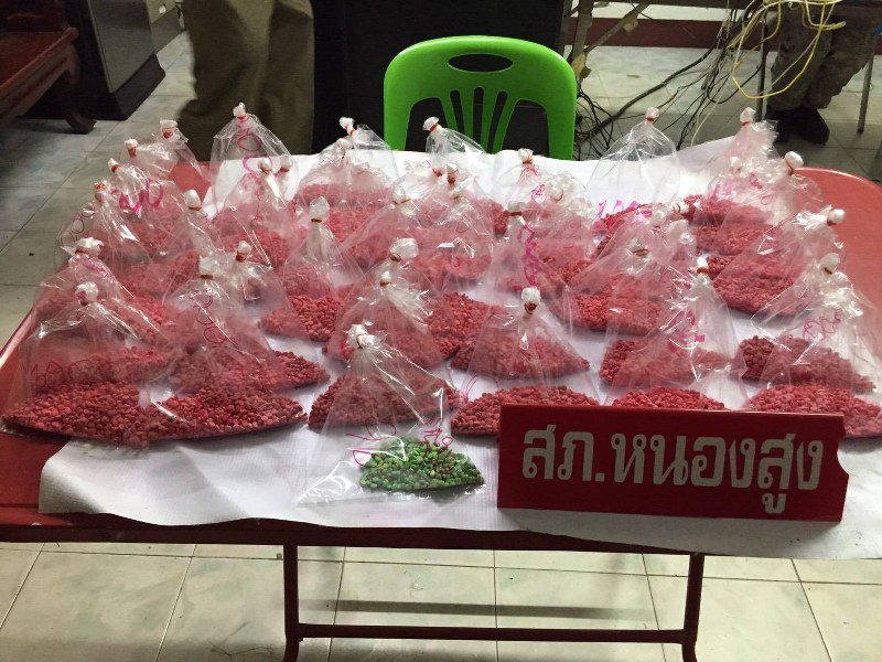 ผู้ต้องสงสัยได้หยุดรถกะทันหัน และลงรถพร้อมหิ้วกระสอบปุ๋ยวิ่งหนี เจ้าหน้าที่ได้วิ่งไล่ติดตามไปจนกระทั่งจับตัวได้ สอบ ถามชื่อคือ นายสันต์ บุญทัน อายุ 48 ปี อยู่บ้านเลขที่ 21/1 หมู่ที่ 3 ต.บางกะไชย อ.แหลมสิงห์ จ.จันทบุรี พร้อมกระสอบปุ๋ยสีฟ้า เมื่อเจ้าหน้าที่ตรวจค้นภายในกระสอบปุ๋ยสีฟ้า พบยาเสพติดให้โทษประเภท 1 (เมตแอมเฟตามีน/ยาบ้า) บรรจุในถุงพลาสติกสีน้ำตาลพันด้วยเทปกาวสีน้ำตาลห่อหุ้มด้วยพลาสติกใส หุ้มด้วยถุงพลาส ติกสีดำ เจ้าหน้าที่จึงควบคุมตัว ผู้ต้องหาพร้อมของกลางมาที่ สภ. หนองสูง และตรวจรับยาบ้าโดยละเอียด ซึ่งมีลักษณะกลมแบนด้านหนึ่งมีอักษรภาษาอังกฤษดับเบิ้ลยูวาย(wy) ด้านหนึ่งผิวเรียบ เม็ดสีส้มจำนวน 39,180 เม็ด และเม็ดสีเขียว จำนวน 396 เม็ด รวม 39,576 เม็ดบรรจุในถุงพลาสติกสีน้ำตาลพันด้วยเทปกาวสีน้ำตาลห่อหุ้มด้วยพลาสติกใส หุ้มด้วยถุงพลาสติกสีดำ พร้อมตรวจยึดรถยนต์นั่งสองตอนท้ายบรรทุก ยี่ห้อเชฟโลเลต สีขาว หมายเลขทะเบียน 5 กก 740 กทม. จำนวน 1 คัน ที่ใช้ในการกระทำความผิด และโทรศัพท์มือถือ ยี่ห้อซัมซุง สีชมพู จำนวน 1 เครื่อง สีดำ จำนวน 1 เครือง รวม 2 เครื่อง