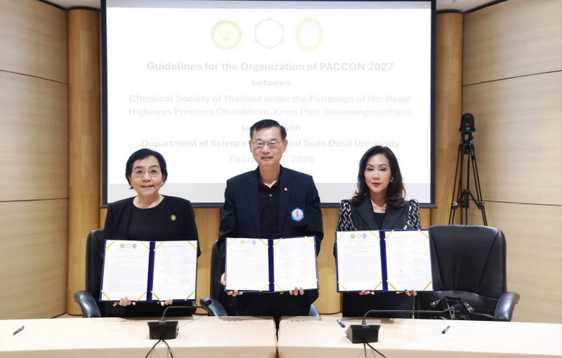 เมื่อวันที่ 13 กุมภาพันธ์ 2569 ณ ศูนย์แสดงนิทรรศการและการประชุมนานาชาติสมเด็จพระนเรศวรมหาราช มหาวิทยาลัยนเรศวร โดยสมาคมเคมีแห่งประเทศไทยในพระอุปถัมภ์ ของศาสตราจารย์ ดร.สมเด็จพระเจ้าน้องนางเธอเจ้าฟ้าจุฬาภรณวลัยลักษณ์ อัครราชกุมารี กรมพระศรีสวางควัฒนวรขัตติยราชนารี ได้มอบหมายให้กรมวิทยาศาสตร์บริการ (วศ.) และมหาวิทยาลัยสวนดุสิต เป็นเจ้าภาพร่วมจัดการประชุมวิชาการนานาชาติ Pure and Applied Chemistry International Conference 2027 (PACCON 2027) ภายใต้ธีม “Chemical Innovation Longevity and Well-being มีวัตถุประสงค์เพื่อเผยแพร่ความรู้ทั้งในส่วนของงานวิจัยพื้นฐาน งานวิจัยประยุกต์และนวัตกรรมในระดับนานาชาติ รวมถึงการสร้างเครือข่ายความร่วมมือทางวิชาการในระดับชาติและนานาชาติ กำหนดจัดขึ้นระหว่างวันที่ 11–13 กุมภาพันธ์ 2570 ณ ศูนย์ประชุมวายุภักดิ์โรงแรมเซ็นทารา ไลฟ์ แจ้งวัฒนะ กรุง เทพมหานคร