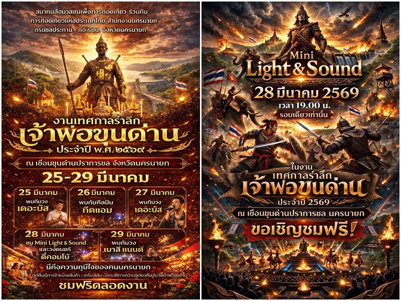 จังหวัดนครนายกเตรียมจัดงานยิ่งใหญ่ครั้งแรกของประวัติศาสตร์ท้องถิ่น “งานรำลึกเจ้าพ่อ ขุนด่าน” ประจำปี 2569 ระหว่างวันที่ 25–29 มีนาคม 2569 ณ บริเวณศาลเจ้าพ่อขุนด่าน เขื่อนขุนด่านปราการชล และลานท้ายเขื่อนขุนด่านปราการชล จังหวัดนครนายก เพื่อเทิดทูนวีรกรรมและสืบสานตำนานของ เจ้าพ่อขุนด่าน (ขุนหาญพิทักษ์ไพรวัน) ผู้พิทักษ์ผืนป่าและเมืองด่านด้านตะวันออกอย่างกล้าหาญ
