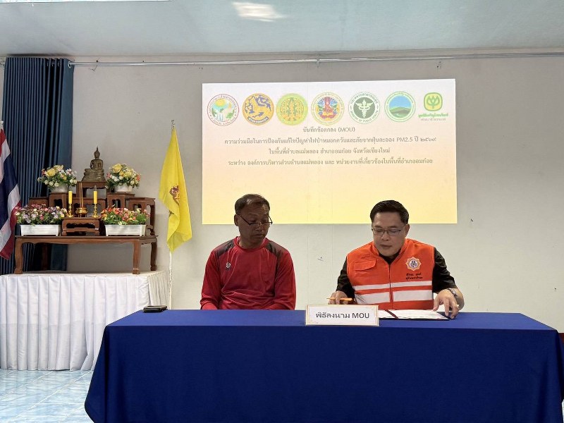 โอกาสนี้ นายอำเภออมก๋อย ได้ร่วมลงนามบันทึกข้อตกลงความร่วมมือ (MOU) กับองค์การบริหารส่วนตำบลแม่หลอง หน่วยงานภาครัฐ ภาคเอกชน และภาคีเครือข่ายภาคประชาสังคม เพื่อแสดงเจตนารมณ์ร่วมกันในการป้องกันและแก้ไขปัญหาไฟป่า ลดผลกระทบจากหมอกควันและฝุ่น PM2.5 ตลอดจนดูแลรักษาทรัพยากรป่าไม้และสุขภาพของประชาชนในพื้นที่