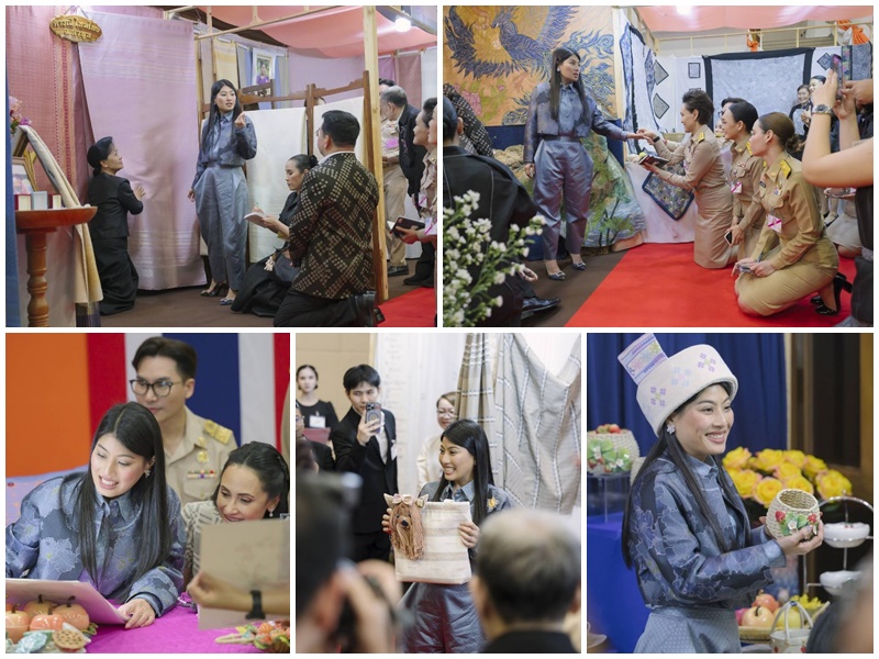 จากนั้น เสด็จประทับ ณ โต๊ะทรงงาน และพระราชทานพระอนุญาตให้กลุ่มศิลปาชีพเข้าเฝ้าทูลเกล้าทูลกระหม่อมถวายผลงานหัตถกรรมชุมชน พร้อมทั้งรับพระราชทานคำแนะนำ โดยกลุ่มศิลปาชีพจากแต่ละจังหวัดได้น้อมนำแนวพระดำริของสมเด็จพระเจ้าลูกเธอ เจ้าฟ้าสิริวัณณวรี นารีรัตนราชกัญญา มารังสรรค์เป็นผลงานหลากหลายรูปแบบ อาทิ ชุดผ้าปูโต๊ะ ผ้ารองจาน และปลอกหมอน ซึ่งประดับตกแต่งด้วยลายผ้าพระราชทาน “ผ้าลายสิริราชพัสตราภรณ์” อย่างประณีตงดงาม อันเป็นการต่อยอดภูมิปัญญาผ้าไทย สร้างงาน สร้างรายได้ และยกระดับคุณภาพชีวิตของประชาชนในชุมชนให้มีความมั่นคงอย่างยั่งยืน
