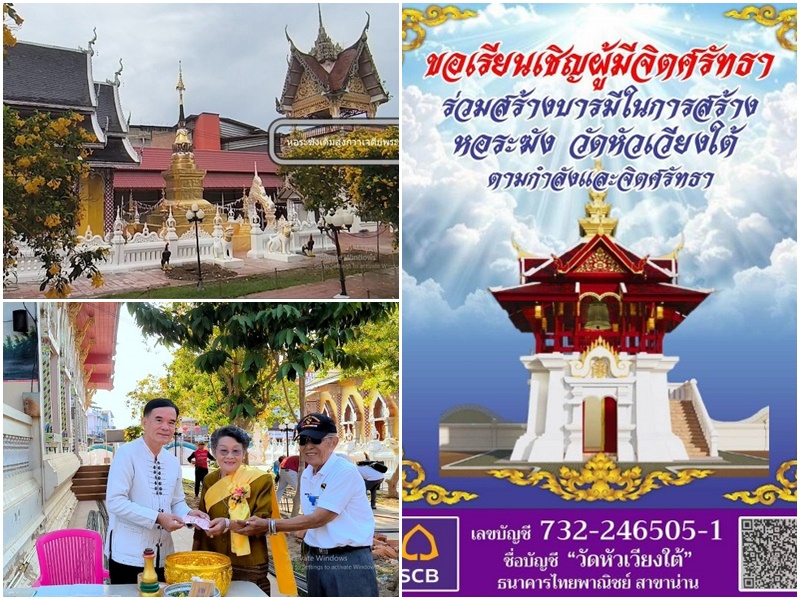 น่าน – วัดหัวเวียงใต้ คณะกรรมการชุมชน ศรัทธาชุมบ้านหัวเวียงใต้ วางศิลาฤกษ์ก่อสร้างอาคารหอระฆังหลังใหม่ เพื่อถวายเป็นสักการบูชา แทนหลังเก่าซึ่งชำรุดทรุดโทรม และความสูงกว่าพระธาตุ เจดีย์ ซึ่งไม่เหมาะสม ราคา 4 ล้าน โดย สล่าคนรุ่นใหม่ลูกหลานคนเมืองน่าน
