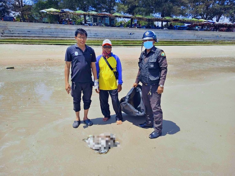 ล่าสุดวันนี้ 8 มีนาคม เจ้าหน้าที่ส่วนอนุรักษ์ทรัพยากรทางทะเล สำนักงานทรัพยากรทางทะเลและชายฝั่งที่ 3 จ.เพชรบุรี ได้รับแจ้งจากเจ้าหน้าที่เทศกิจเทศบาลเมืองชะอำ ว่าพบสัตว์ทะเลเกยตายลอยมาเกยตื้น บริเวณหาดชะอำด้านทิศใต้หน้าลุมพินีพาร์คบีช พิกัด 12°46’45.3″N 99°58’42.4 อำเภอชะอำ จังหวัดเพชรบุรี จึงเดินทางไปตรวจสอบที่เกิดเหตุพร้อมประสานไปยังศูนย์วิจัยทรัพยากรทางทะเลและชายฝั่งอ่าวไทยตอนบนเข้าร่วมตรวจสอบ โดยเจ้าหน้าที่ตรวจแล้วเป็นซากเต่าตนุ (Green Turtle) ขนาดความยาว ประมาณ 47 ซม. กว้าง 44 ซม. ด้านหลังกระดองพบรอยแตก ไม่ทราบเพศเนื่องจากมีสภาพเน่าเปื่อยมาก เจ้าหน้าที่จึงดำเนินการทำการจัดเก็บกู้ซากเต่าตนุก่อนนำไปฝังกลบอย่างถูกวิธิต่อไป