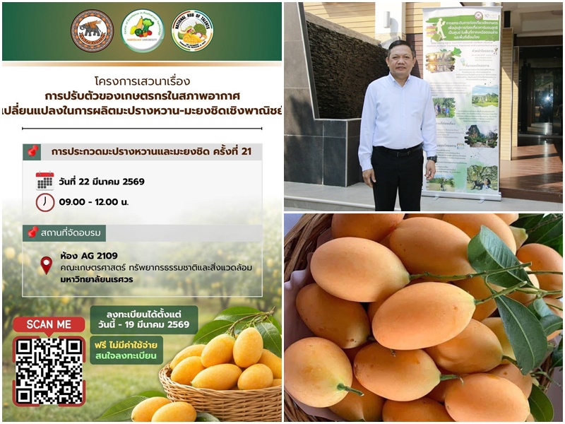 รศ.ดร. พีระศักดิ์ ฉายประสาท มหาวิทยาลัยนเรศวร หัวหน้าศูนย์รวมผู้เชี่ยวชาญด้านเทคโน โลยีหลังการเก็บเกี่ยวและแปรรูปผลไม้ สำนักงานการวิจัยแห่งชาติ (วช.)กระทรวง (อว.) ขอเชิญร่วมงานมะปรางหวาน-มะยงชิด ครั้งที่ 21 ในวันที่ 22 มีนาคม 2569 ณ คณะเกษตร ศาสตร์ ทรัพยากรธรรมชาติและสิ่งแวดล้อม มหาวิทยาลัยนเรศวร จังหวัดพิษณุโลก