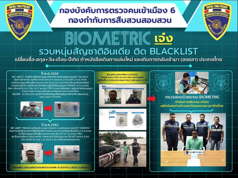 พล.ต.ต.พีรวัสฯ กล่าวว่า กองกำกับการสืบสวนสอบสวน กองบังคับการตรวจคนเข้าเมือง 6 ได้ดำเนินการสืบสวนหาข่าวในพื้นที่ จ.สงขลา ซึ่งต่อมาได้พบข้อมูลว่ามีกลุ่มบุคคลสัญชาติอินเดียที่เคยถูกผลักดันส่งกลับไปยังประเทศอินเดีย เดินทางกลับเข้ามาในราชอาณาจักร โดยใช้หนังสือเดินทางที่เปลี่ยนแปลง แก้ไขข้อมูลบุคคล เพื่อหลีกเลี่ยงการตรวจสอบรายชื่อบุคคลต้องห้ามเข้าราชอาณาจักร (BLACKLIST) จึงได้ทำการสืบสวนขยายผลโดยอาศัยข้อมูลการแจ้งคนต่างด้าวเข้าพัก และข้อมูลลายพิมพ์นิ้วมือบุคคลต้องห้ามฯ ในระบบ Biometrics เพื่อใช้เป็นข้อมูลในการสืบสวนจับกุมกลุ่มบุคคลดังกล่าว