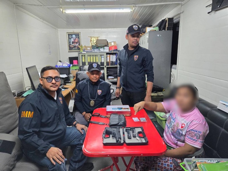 วันที่ 5 เม.ย.69 เวลา 20.00 น. เจ้าหน้าที่จึงได้นำกำลังชุดสืบสวน เข้าตรวจค้นห้องพักดังกล่าวพบ MISS.SAN SAN KHAING อายุ 42 ปี สัญชาติเมียนมา พร้อมด้วยของกลาง 1.ปืนพกสั้น ขนาด .38 จำนวน 1 กระบอก, 2.แม็กกาซีน 2 อัน, 3.เครื่องกระสุนปืน ขนาด .380