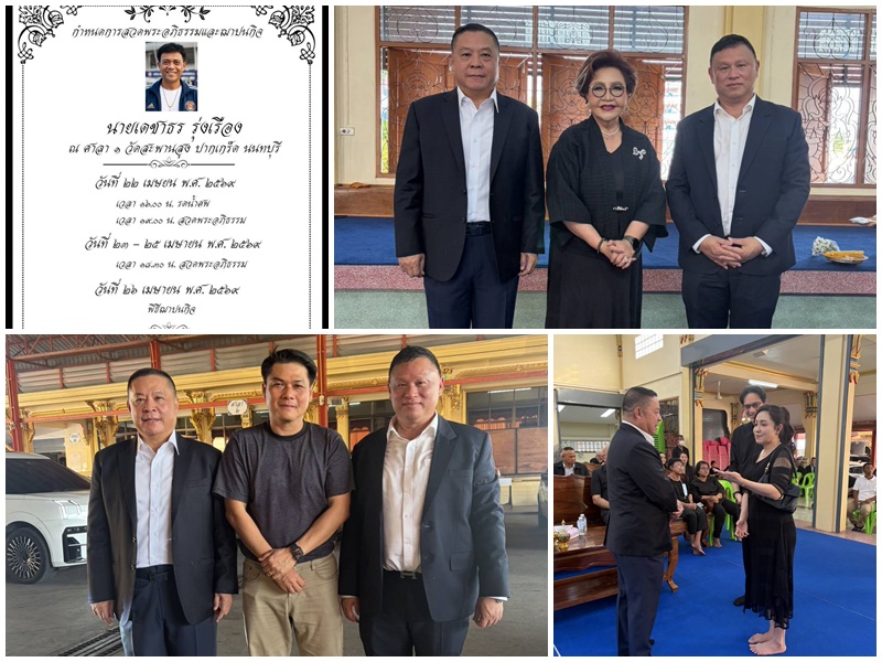 วันที่ 22 เม.ย.2569 เวลา 16.00 น. พล.ต.อ.อัคราเดช พิมลศรี ที่ปรึกษา ตร., พล.อ.อ.วรชาติ ฟองชล, พล.ร.ท.นิรัตน์ ทากุดเรือ, ดร.หิมาลัย ผิวพรรณ (กลุ่ม ตท.25) ได้เดินทางมาร่วมพิธีรดน้ำศพ นายเดชาธร รุ่งเรือง (ตูน) ผู้สื่อข่าวอาวุโส ณ วัดสะพานสูง ต.คลองพระอุดม อ.ปากเกร็ด จ.นนทบุรี