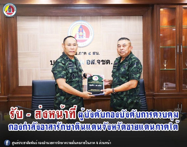 วันนี้ ( 25 พฤศจิกายนยน 2562) เวลา 13.00 น. ที่ห้องประชุม บังคับการควบคุมกองอาสารักษาดินแดนจังหวัดชายแดนภาคใต้ ค่ายสิรินธร ตำบลเขาตูม อำเภอยะรัง จังหวัดปัตตานี กองบังคับการควบคุมกองกำลังกำลังอาสารักษาดินแดนจังหวัดชายแดนภาคใต้ จัดพิธีรับ – ส่งหน้าที่ ผู้บังคับกองบังคับการควบคุมกองอาสารักษาดินแดนจังหวัดชายแดนภาคใต้ ระหว่าง พลโท สมพล ปานกุล และ พลตรี มโนช จันทร์คีรี โดยมีคณะนายทหาร, นายสิบ และลูกจ้างร่วมพิธี