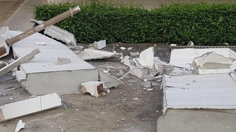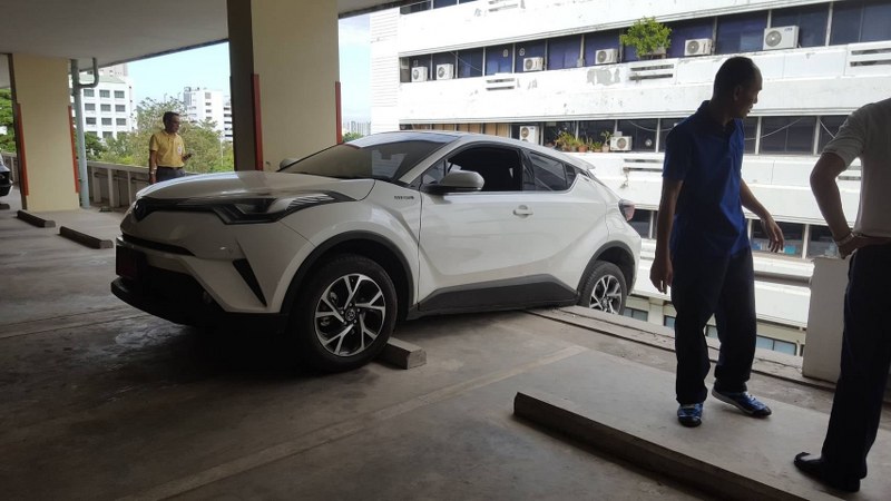 ที่เกิดเหตุเป็นอาคารจอดรถรถสูง 6 ชั้นบริเวณ ชั้น a4 พบรถเก๋งป้ายแดงยี่ห้อ Toyota รุ่น hrv สีขาวบริเวณล้อหลังยื่นออกมานอกอาคารบริเวณประตูด้านคนขับได้รับความเสียหายที่จับหักขอบกำแพงปูนกั้นอาคารจอดรถแตกหักหล่นลงไปด้านล่าง