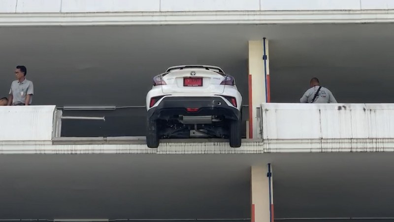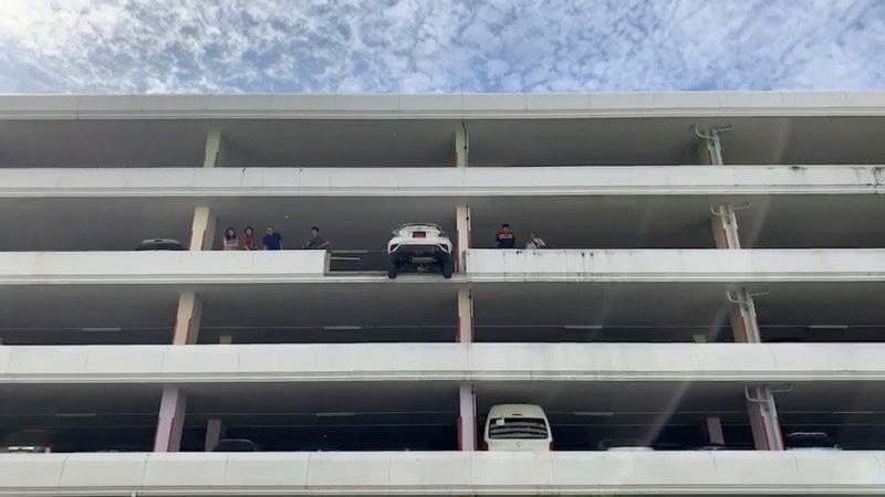 นนทบุรี หวิดดับ หญิงขับรถป้ายแดงเข้าเกียร์ผิดรถค้างอยู่ชั้น 4 ลานจอดรถ
