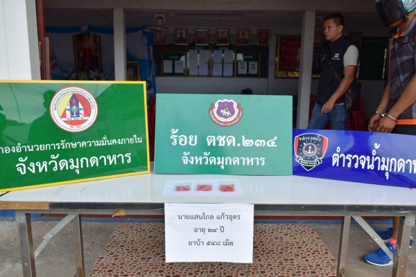 เมื่อเวลา 10.00น.วันที่ 28 พฤศจิกายน 2562 ร.ต.อ. ชัย วัฒน์ ศรีค้อ หน.ชปข.ร้อยตชด.234 จ.มุกดาหารนำเจ้าหน้าที่ชุดจับกุมพร้อมผู้ต้องหานายแสนไกล แก้วอุดร อายุ 24 ปี อยู่บ้านเลขที่ 6 ม.4 ต.หนองเอี่ยน อ.คำชะอี จ.มุกดาหารพร้อมของกลางยาบ้ารวมจำนวน 548เม็ดมาตั่งโต๊ะแถลงข่าว