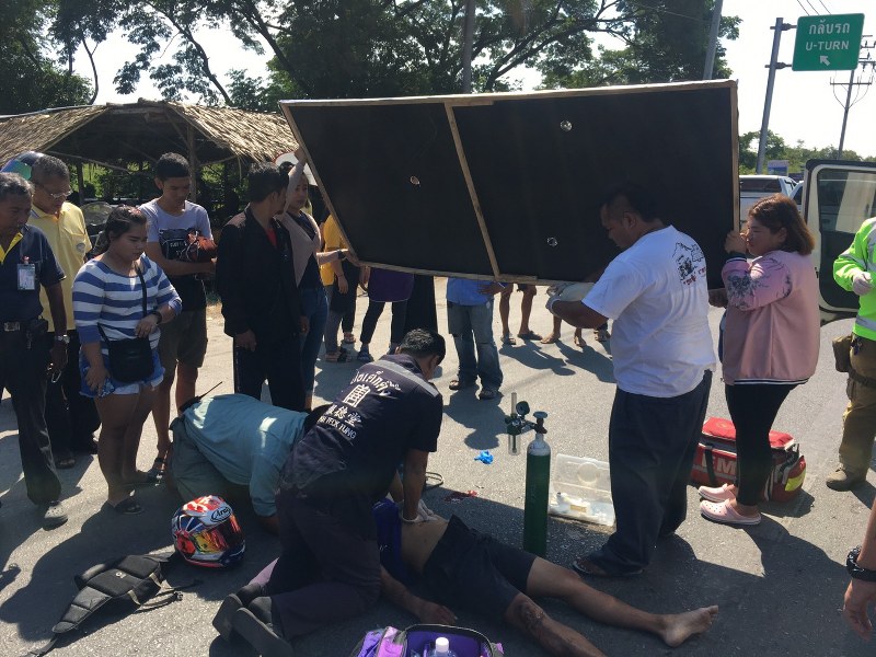 นนทบุรี กู้ภัยเร่งยื้อชีวิตหนุ่มขับบิ๊กไบค์เสียหลักชนแท็กซี่ สุดท้ายเสียชีวิต