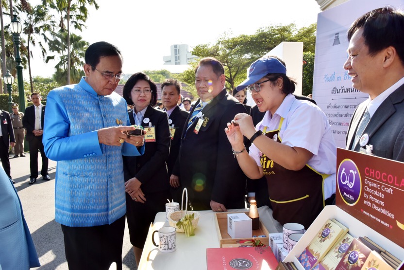 โอกาสนี้ นายกรัฐมนตรีได้กล่าวให้กำลังใจแก่คนพิการต้นแบบ คือ นายดำเกิง มุ่งธัญญา (ไอซ์) คนพิการทางการเห็น นายชาตรี กรวัชรธาดา (ต๊อด) คนพิการทางการเคลื่อนไหว และนางสาวกาญจนา พิมพา คนพิการทางการได้ยิน พร้อมยืนยันรัฐบาลเน้นสร้างความเท่าเทียมในสังคม ส่งเสริมการศึกษาแก่ผู้พิการ พร้อมทั้งสนับสนุนการดูแลผู้พิการให้มากที่สุด และร่วมชิมช็อกโกแลตเย็น ซึ่งเป็นสินค้าที่ผลิตโดยผู้พิการ นอกจากนี้ นายกรัฐมนตรีเน้นย้ำหน่วยงานที่เกี่ยวข้อง ทั้งภาครัฐ เอกชน ภาคประชาสังคม ร่วมมือกันเดินหน้าป้องกันการทุจริต ต่อต้านการคอร์รัปชั่น พร้อมเชิญชวนทุกภาคส่วนร่วมกันสนับสนุนผลิตภัณฑ์จากชุมชน เพื่อสร้างรายได้ให้แก่ประชาชนในชนบท เกิดการกระจายรายได้และหมุนเวียนเศรษฐกิจในระดับฐานราก ด้วย