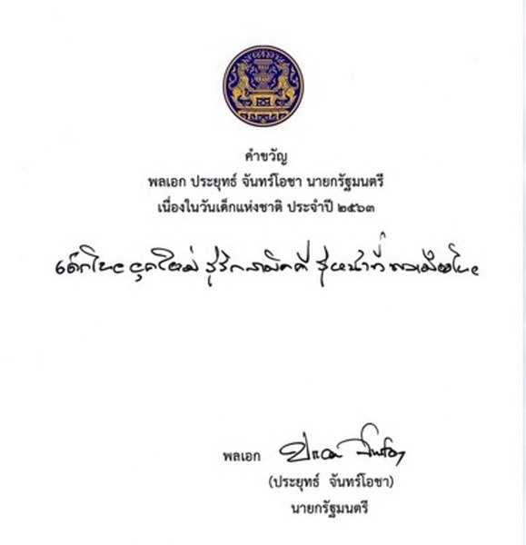 วันที่ 13 ธ.ค. 2562 พลเอกประยุทธ์ จันทร์โอชา นายกรัฐมนตรีและรัฐมนตรีว่าการกระทรวงกลาโหม ได้มอบคำขวัญ เนื่องในวันเด็กแห่งชาติ ประจำปี 2563 ว่า “เด็กไทยยุคใหม่ รู้รักสามัคคี รู้หน้าที่พลเมืองไทย”