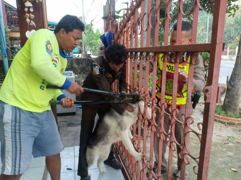 ซึ่งพบเป็นสุนัขไซบีเรียนเพศผู้ คอติดกับประตูรั้ว เจ้าหน้าที่จึงใช้คีมตัดเหล็ก ตัดประตูรั้ว ใช้เวลาประมาณ 15 นาที สุนัขจึงหลุดออกจากประตูรั้วได้โดยปลอดภัย