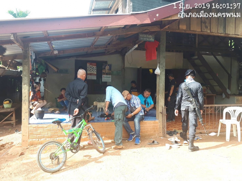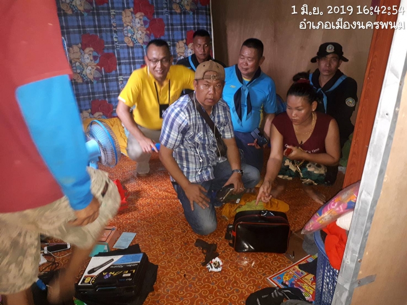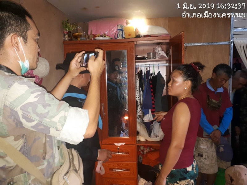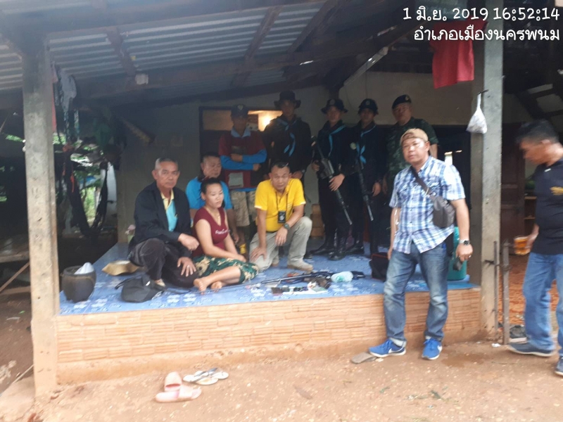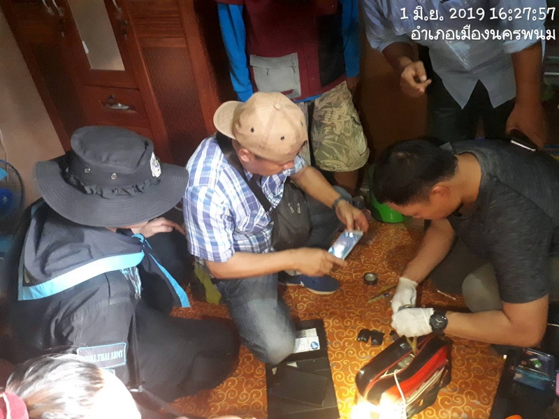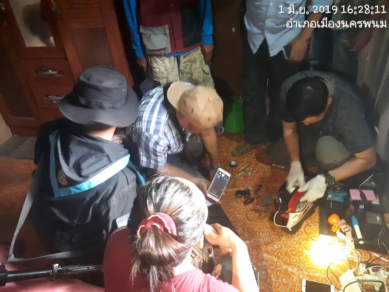 ครั้นเมื่อเวลาประมาณ 16.20 น. เจ้าหน้าที่จึงได้เข้าทำการปิดล้อมบ้านเลขที่ 213 ม.7 บ.พรเจริญ ต.วังตามัว อ.เมืองนครพนม จว.น.พ. บริเวณพิกัด VE 480115 เพื่อที่จะติดตามตัว นายอ้วน แต่เมื่อ จนท.มาถึงบ้านหลังดังกล่าวไม่พบนายอ้วน พบแต่ น.ส.สุภาพร จันทร์ภิรม ซึ่งเป็นภรรยา ของ นายอ้วน ต่อมา จนท.จึงได้ชี้แจงการปฏิบัติให้กับ น.ส.สุภาพร ฯ และได้เชิญ นายรื่นรมย์ บุญจอง อายุ 45 ปี ผู้ใหญ่บ้านพรเจริญ มาเป็นพยานในการตรวจค้นบ้านหลังดังกล่าวผลการตรวจค้น ตามร่างกายไม่พบสิ่งผิดกฎหมาย จึงได้ทำการตรวจค้นภายในบ้าน พบกระเป๋าสะพายสีดำ – แดง เปิดดูข้างในพบวัตถุสีดำพันด้วยเทปกาวสีดำ จำนวน 3 ก้อน เปิดออกดูพบเป็นยาบ้า บรรจุอยู่ในถุงพลาสติกสีน้ำเงินแบบกดปิด-ดึงเปิด วางอยู่ข้างที่นอน และค้นเจออาวุธปืนไทยประดิษฐ์สั้น (ขนาด .38) พร้อมลูกกระสุน ขนาด.38 ซุกซ่อนในกระเป๋าสะพายสีน้ำตาลห่อด้วยซองบุหรี่ จึงได้ทำการตรวจยึดและแจ้งข้อกล่าวหาในการจับกุมให้ทราบ และนำผู้ต้องหา พร้อมด้วยของกลาง มาทำบันทึกการจับกุม สอบสวน ขยายผล ที่ร้อย ตชด.236