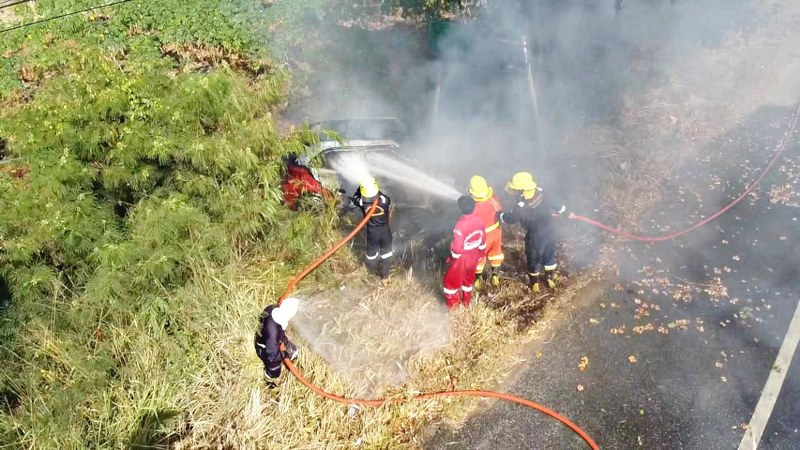 ที่เกิดเหตุพบแสงเพลิงกำลังลุกไหม้ รถเก๋ง ยี่ห้อ MG สีแดง หมายเลขทะเบียน 9กฎ2175 กทมอย่างรวดเร็วทางเจ้าหน้าที่ดับเพลิงเร่งทำการฉีดน้ำควบคุมเพลิง แต่เนื่องจากไฟได้ลุกท่วมถังน้ำมันตัวรถ ทำให้เพลิงลุกไหม้ตัวรถจนหมดทั้งคัน ห่างออกไปในศาลาพักผู้โดยสารริมทา งพบร่างผู้ได้รับบาดเจ็บเป็นชาย1ราย มีแผลแตกที่ศีรษะและได้รับกระแทกบริเวณหน้าอกอยู่ในอาการมึนงง ทราบชื่อต่อมาคือนาย เอกพจน์ วิบูลสถาพรชัย อายุ 30 ปี เจ้าหน้าที่กู้ภัยนำส่งรักษายังโรงพยาบาลวัดญาณสังวรารามฯ โดยก่อนหน้ามีพลเมืองดี เข้าไปให้การช่วยเหลือนำผู้บาดเจ็บออกมาจากตัวรถได้ก่อนจะเกิดไฟลุกท่วม