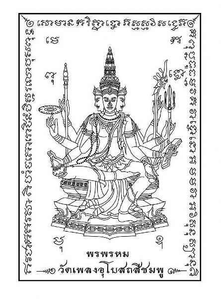 ด้านหน้าเป็นรูป พระพรหมมี มี 4 กร หัตถ์เบื้องซ้ายถือคัมภีร์ใบลาน หัตถ์เบื้องขวามีสายสร้อยไข่มุก หัตถ์ขวาถือคันโท อีกหัตถ์หนึ่งถือพิณ และหัตถ์ที่เหลือถือ ตรี คาฑา จักร สังข์ ประทับบนบัลลังก์ ด้านล่างเขียน พรพรหม วัดเพลงอุโบสถสีชมพู ขอบเหรียญ เป็นยันต์เขียนกำกับไว้รอบทั้ง 3 ด้าน