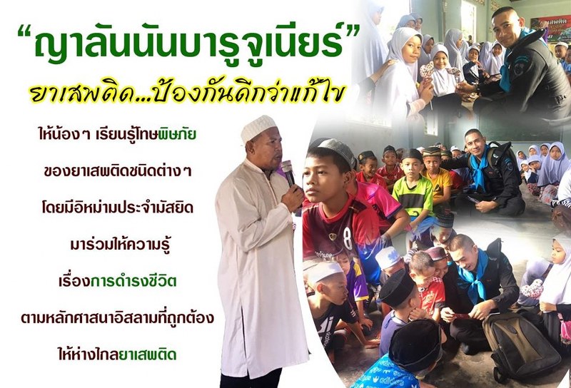 ค่ายญาลันนันบารูจูเนียร์ ป้องกันภัยยาเสพติด หน่วยเฉพาะกิจกรมทหารพรานที่ 49 พร้อมด้วย ผู้นำศาสนา และประชาชนในพื้นที่ ร่วมกิจกรรมป้องกันภัยยาเสพติดให้กับเด็กอายุระหว่าง 7-12 ปี ภายใต้โครงการ “ญาลันนันบารูจูเนียร์” ห้วงวันที่ 21-22 ธ.ค. 62 ณ โรงเรียนตาดีกาบ้าน สุแฆ ม.3 ต.ดุซงญอ อ.จะแนะ จ.นราธิวาส