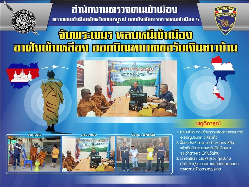 เจ้าหน้าที่ชุดสืบสวนฯ ตรวจคนเข้าเมืองจังหวัดเพชรบูรณ์ จึงได้แสดงตนว่าเป็นเจ้าหน้าที่ และขอตรวจสอบเอกสารประจำตัว พระทั้ง 2 รูป ให้การกับเจ้าหน้าที่ว่า พวกตนเป็นคนต่างด้าวสัญชาติกัมพูชา เดินทางหลบหนีเข้ามาทางช่องทางธรรมชาติในเขตพื้นที่ อ.อรัญ ประเทศ จ.สระแก้ว โดยไม่มีหนังสือเดินทาง ไม่มีบัตรผ่านแดน และไม่ผ่านการตรวจจากพนักงานเจ้าหน้าที่ตรวจคนเข้าเมือง หลังจากที่หลบหนีเดินทางเข้ามาในเขตพื้นที่ จ.สระแก้ว แล้วได้ขึ้นรถประจำทางมาลงที่ จ.นครราชสีมา และเดินขอรับเงินจากประชาชน ซึ่งในระหว่างทางก็จะแวะพักค้างแรมตามวัดไทยเรื่อยมา จนกระทั่งมาถึง จ.เพชรบูรณ์