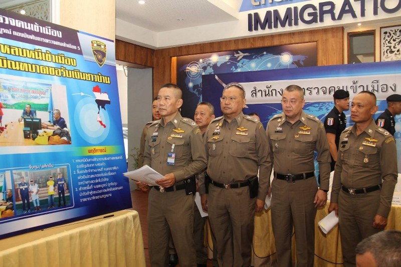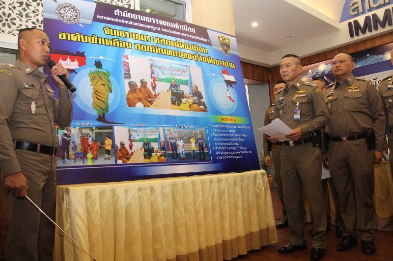 วันที่ 23 ธ.ค.62 เวลา 10.00 น.ณ บริเวณห้องโถงชั้นล่าง อาคาร 2 สตม.(สวนพลู) สาธร กทม. : พล.ต.ท.สมพงษ์ ชิงดวง ผบช.สตม. พร้อมด้วย พล.ต.ต.พรชัย ขันตี, พล.ต.ต.อิทธิพล อิทธิสารรณชัย, พล.ต.ต.สุรพงษ์ ชัยจันทร์, พล.ต.ต.ณฐพล แสวงกิจ, พล.ต.ต.ชูฉัตร ธารีฉัตร รอง ผบช.สตม., พล.ต.ต.ปฺฏิพัทธ์ สุบรรณ ณ อยุธยา รอง ผบช.ตชด. ปฏิบัติราชการ สตม., พล.ต.ต.ชำนาญ ชำนาญเวช ผบก.ตม 5, พ.ต.อ.เอกกร บุษบาบดินทร์ รอง ผบก.ตม.5 และ พ.ต.ต.ภูวดล ภูมี สว.ตม.จ.เพชรบูรณ์ ร่วมแถลงข่าว รวบพระเขมรหลบหนีเข้าเมือง อาศัยผ้าเหลือง ออกบิณฑบาตขอรับเงินชาวบ้าน