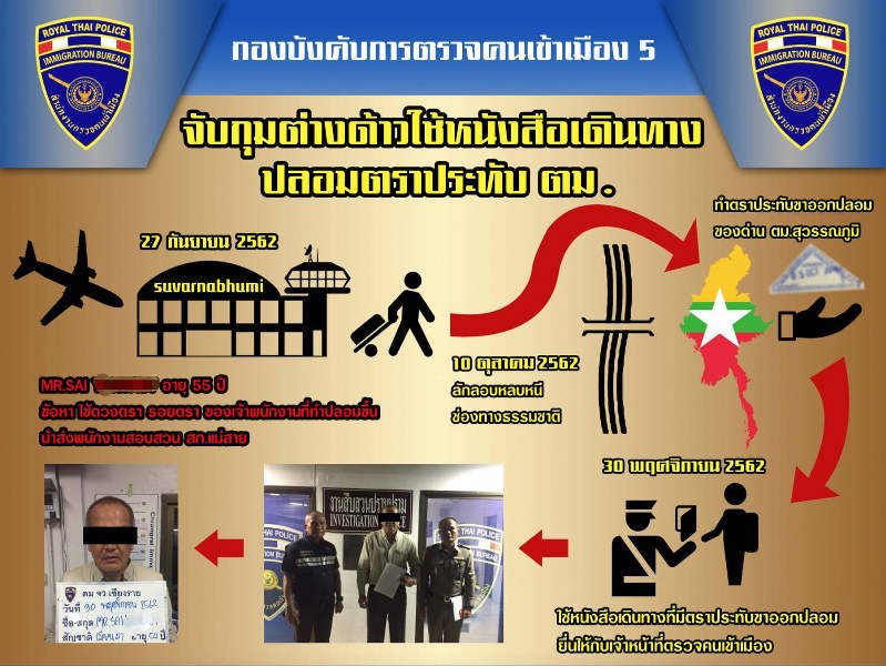 เมื่อเจ้าหน้าที่รับหนังสือเดินทางมาตรวจสอบพบพิรุธรอยตราประทับขาออกในการเดินทางครั้งล่าสุด มีลักษณะผิดปกติ ไม่มีอักษรตัว S ตามด้วยหมายเลขตราประทับ และวันที่เดินทางในตราประทับขาออกดังกล่าวดูบิดเบี้ยว และไม่อยู่ตรงกลางตราประทับ จึงได้ตรวจสอบในระบบ BIOMETRICS (ภาพถ่ายใบหน้าและลายพิมพ์นิ้วมือ) พบว่าไม่มีข้อมูลการเดินทางออกของผู้ถูกจับในระบบแต่อย่างใด และได้ส่งรอยตราประทับดังกล่าวให้ด่าน ตม.สุวรรณภูมิ ตรวจสอบ รับแจ้งว่าเป็นรอยตราประทับของปลอม ซึ่งผู้ต้องหาเดินทางเข้ามาในราชอาณาจักรครั้งล่าสุดเมื่อวันที่ 27 กันยายน 2562 ด้วยประเภทวีซ่า ผผ.14 อนุญาตให้อยู่ถึงวันที่ 10 ตุลาคม 2562