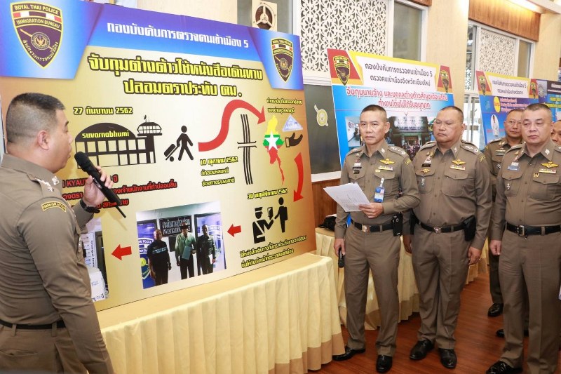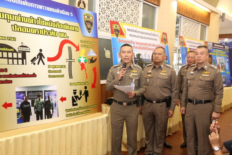 วันที่ 23 ธ.ค.62 เวลา 10.00 น.ณ บริเวณห้องโถงชั้นล่าง อาคาร 2 สตม.(สวนพลู) สาธร กทม. : พล.ต.ท.สมพงษ์ ชิงดวง ผบช.สตม. พร้อมด้วย พล.ต.ต.พรชัย ขันตี, พล.ต.ต.อิทธิพล อิทธิสารรณชัย, พล.ต.ต.สุรพงษ์ ชัยจันทร์, พล.ต.ต.ณฐพล แสวงกิจ, พล.ต.ต.ชูฉัตร ธารีฉัตร รอง ผบช.สตม., พล.ต.ต.ปฺฏิพัทธ์ สุบรรณ ณ อยุธยา รอง ผบช.ตชด. ปฏิบัติราชการ สตม., พล.ต.ต.ชำนาญ ชำนาญเวช ผบก.ตม 5, พ.ต.อ.เอกกร บุษบาบดินทร์ รอง ผบก.ตม.5 และ พ.ต.อ.ณัฐวุฒิ แสงเดือน ผกก.ตม.เชียงราย ร่วมแถลงข่าวผลการจับกุมผู้ต้องหาชาวเมียนมา ใช้หนังสือเดินทางปลอมรอยตราประทับ